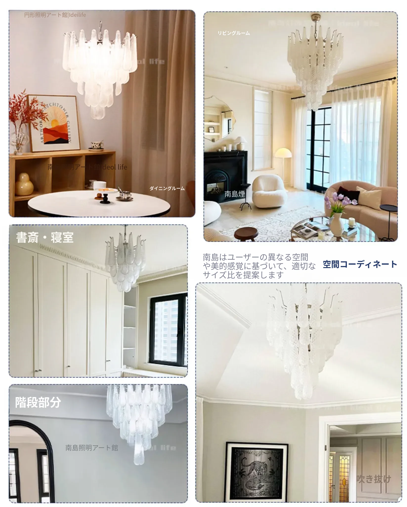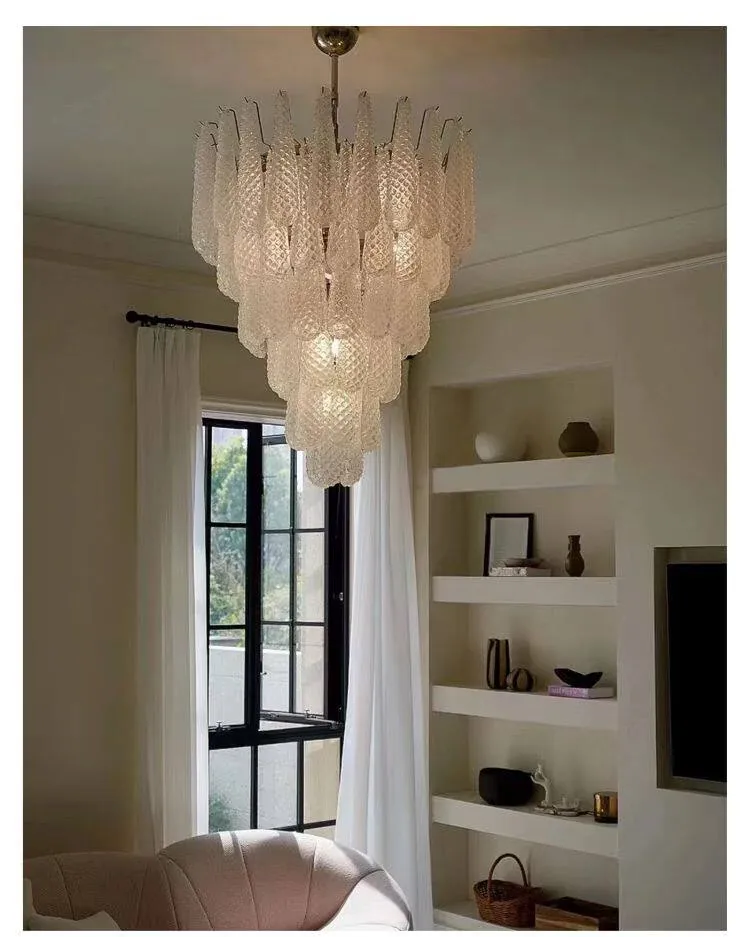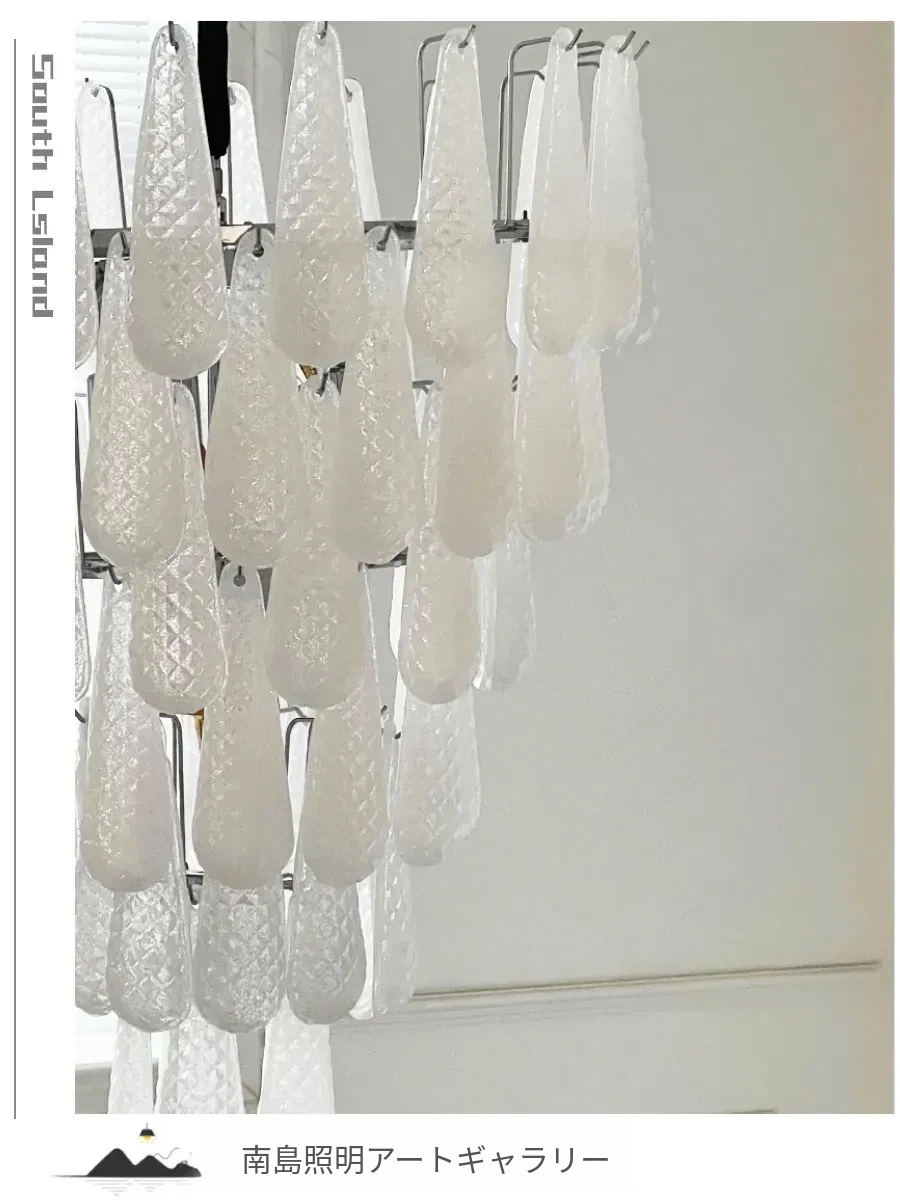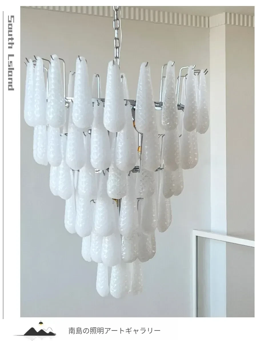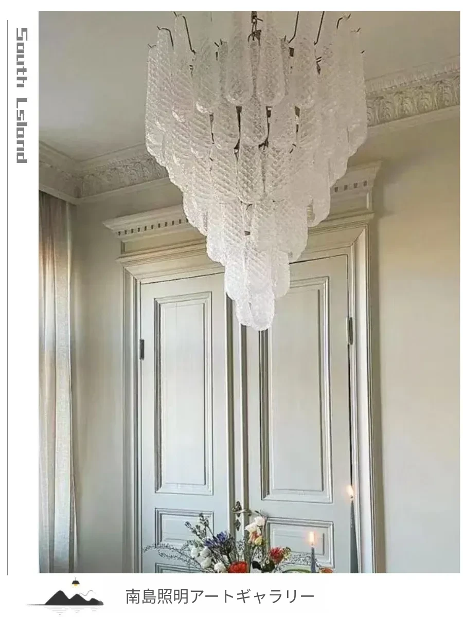 フランス製MURANOガラスシャンデリア - 中古ヴィラ向けのラグジュアリーな空間演出、吹き抜けLOFT階段やダイニングに最適な滝のような美しさを持つ照明。