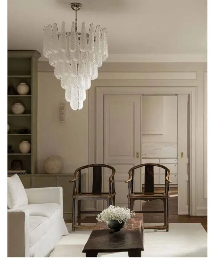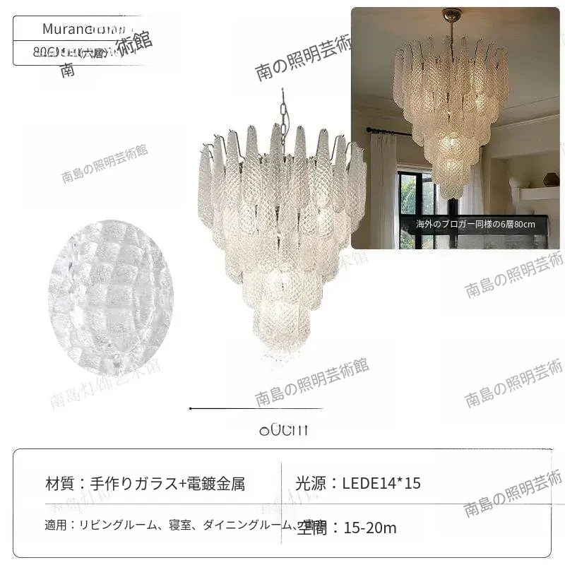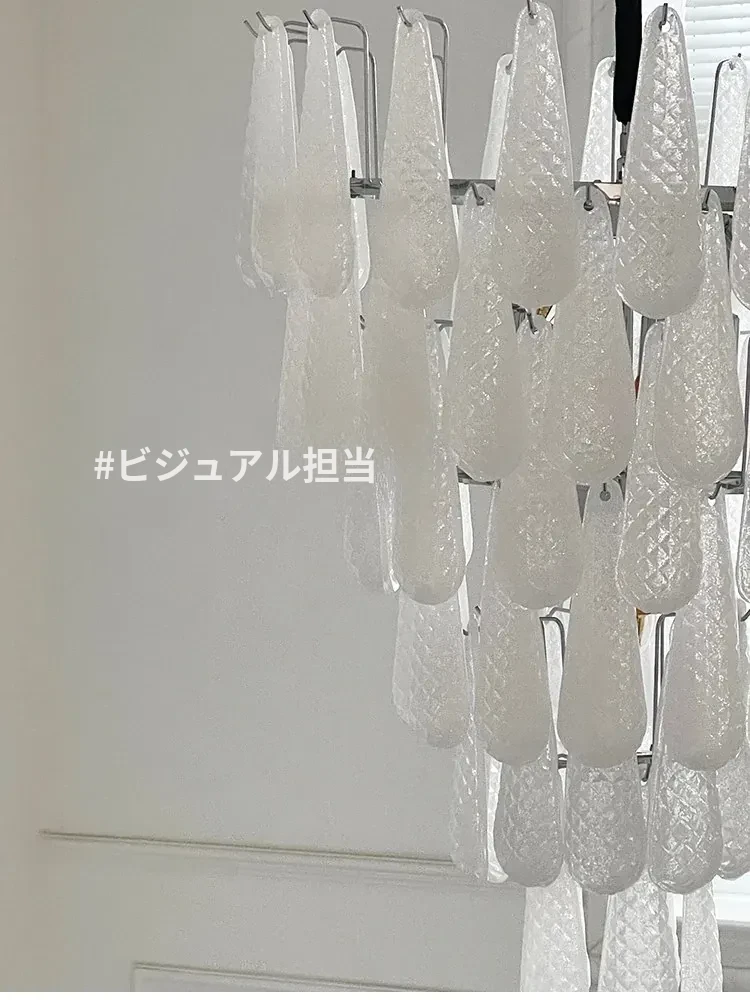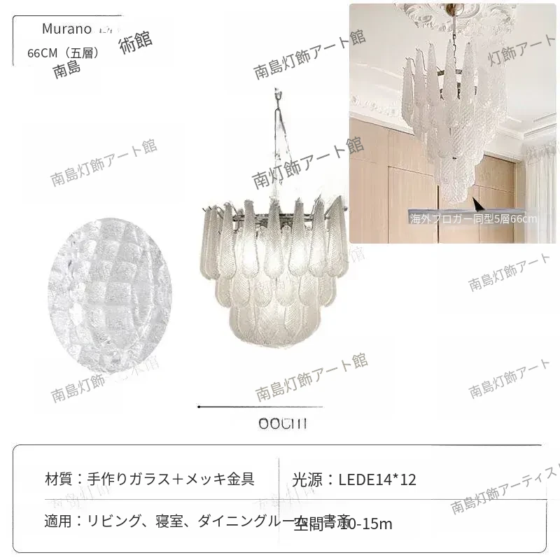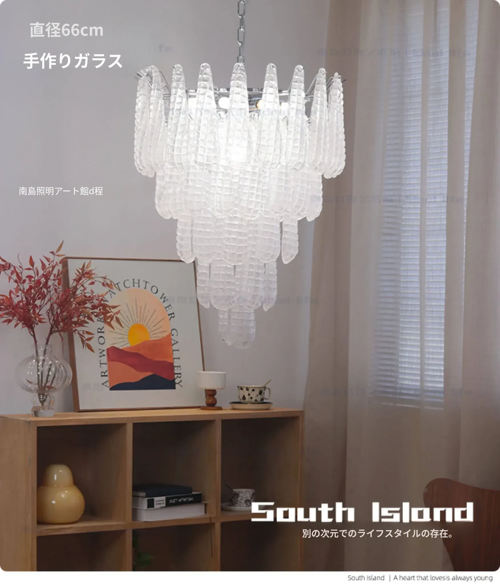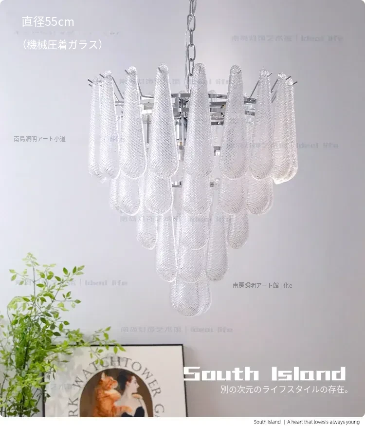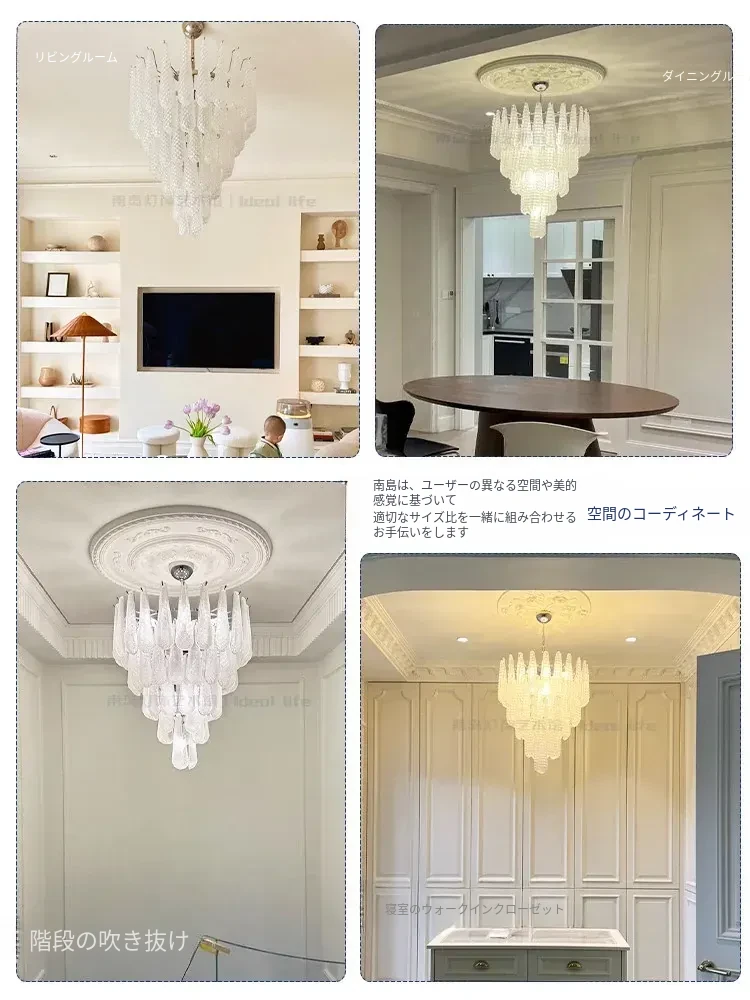 フランス製MURANOガラスシャンデリア - 中古ヴィラ向けのラグジュアリーな空間演出、吹き抜けLOFT階段やダイニングに最適な滝のような美しさを持つ照明。