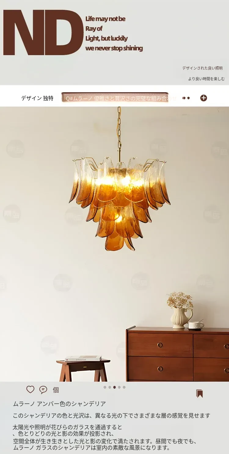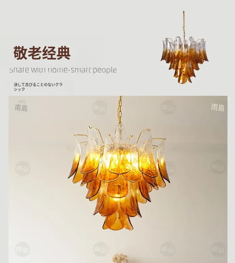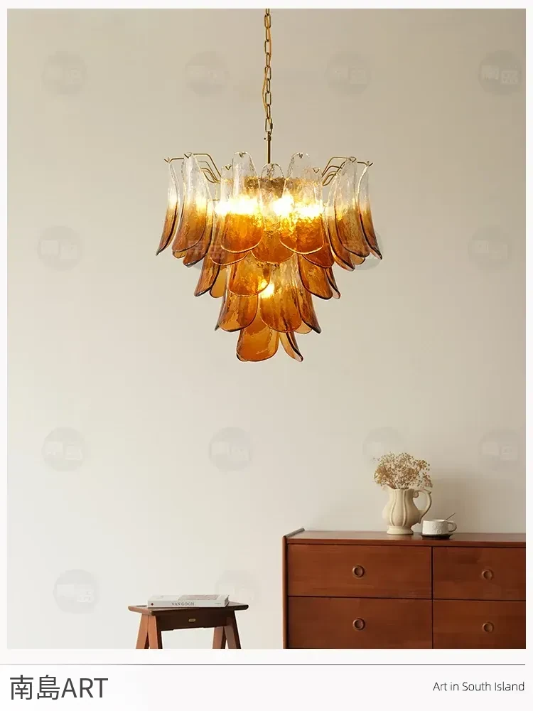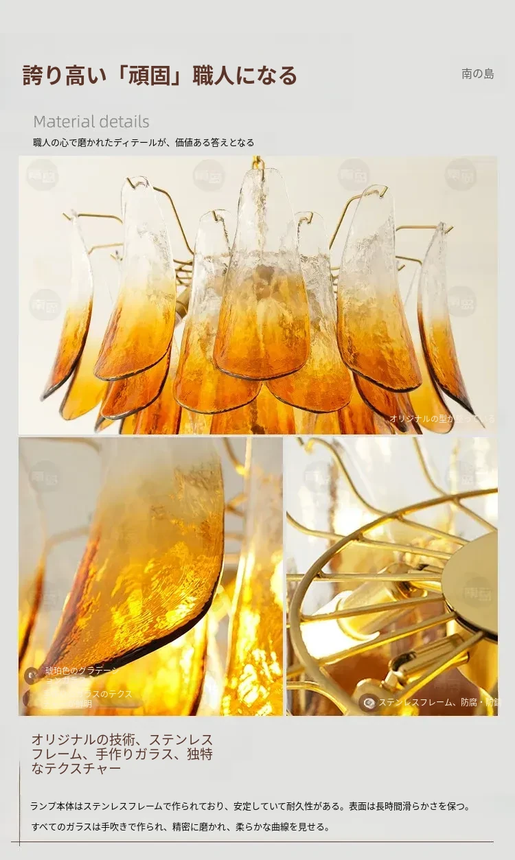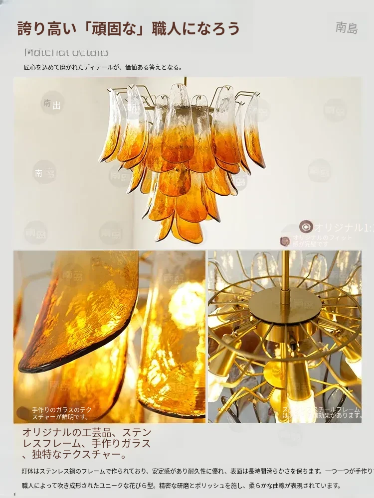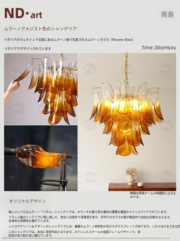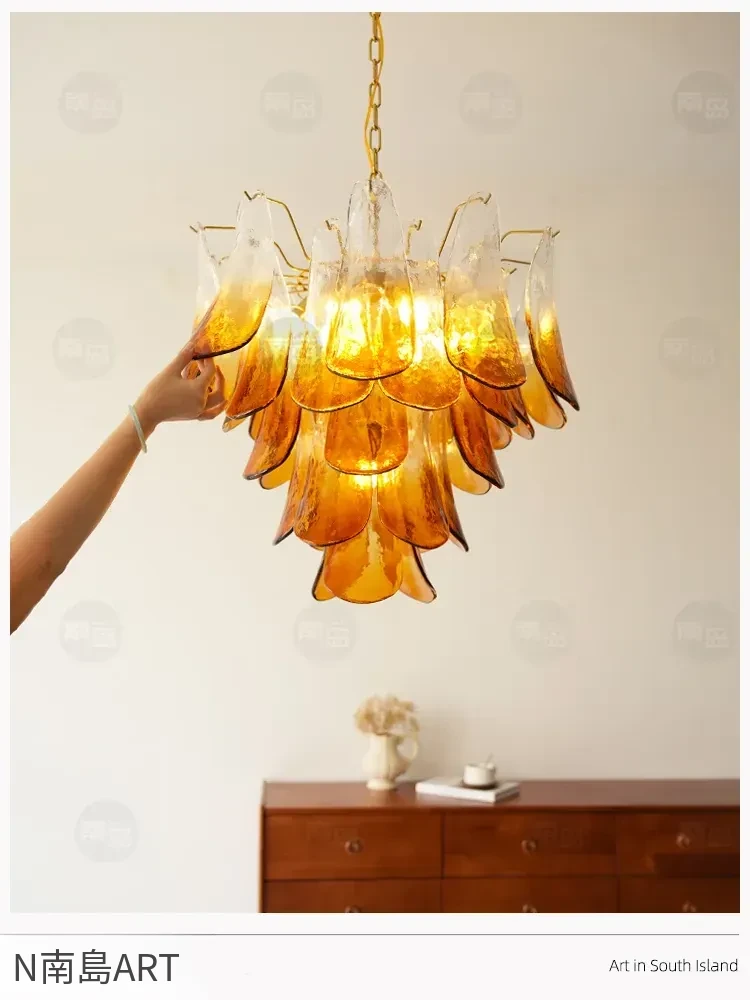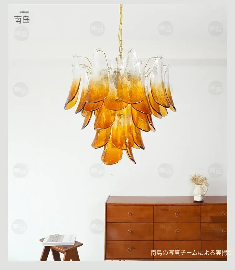 フランス風ヴィンテージMuranoムラノ琥珀花びらガラスシャンデリア - レトロなデザインでリビング、寝室、書斎、ダイニングを華やかに彩る美しい照明。高級感溢れるインテリアを演出します!