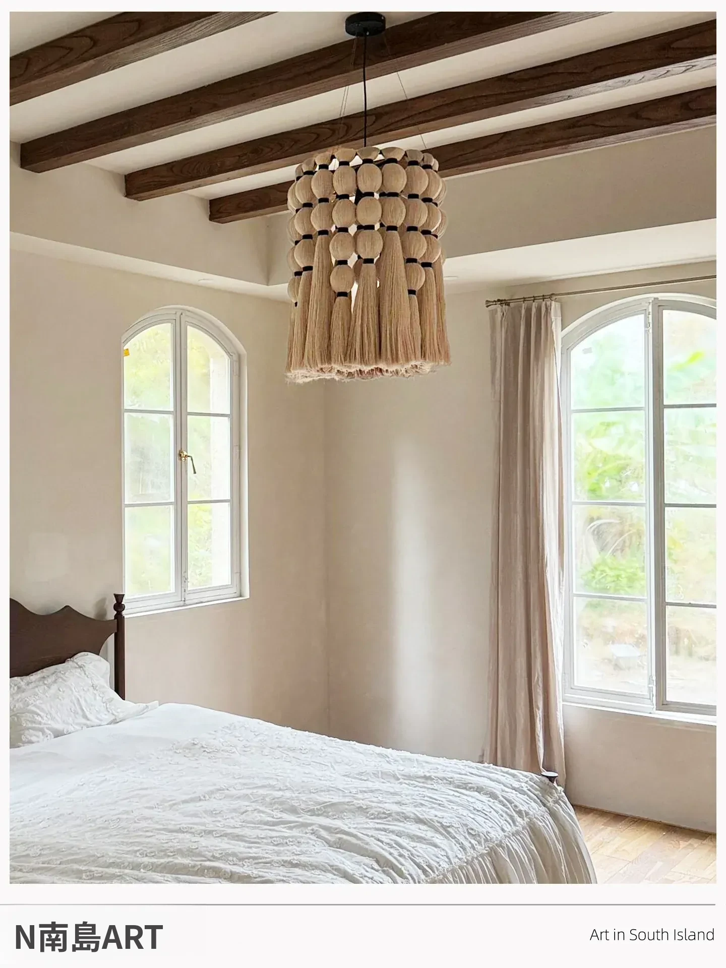 フレンチデザインの中古手作りタッセルシャンデリア - リビング・ダイニングに最適なコットンリネン製のレトロな寝室や書斎用ライト!おしゃれで温かみのある空間を演出します。
